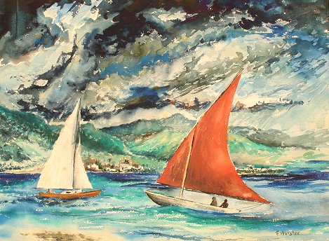 WURSTER, Franklin E., (American, 20th C): Sailboats Off a Tropical Coast, W/C, 17'' x 23'' sight size, signed, framed 26'' x 30'', no glass.