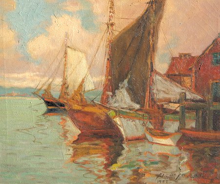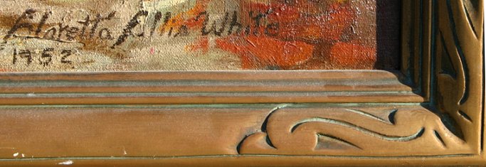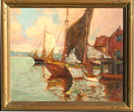 WHITE, Claretta Ellis, (American, 20th C.): Dockside Scene, O/C, 25'' x 30'', signed, period gilt carved frame with wear, 30'' x 35''.