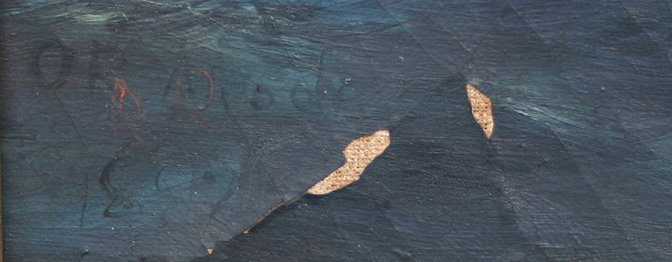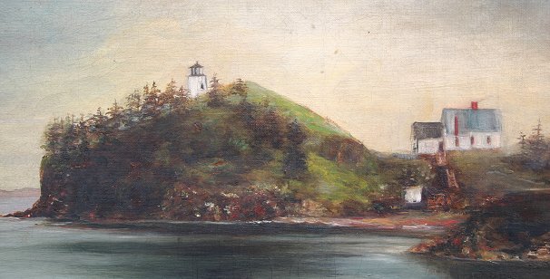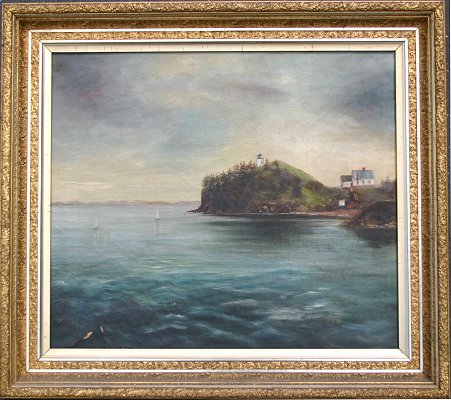 19TH C PAINTING OF OWLS HEAD, NEAR ROCKLAND, MAINE: O/C, 19'' x 22'', illegibly signed and dated, period gilded frame with minor wear and gold paint, 24'' x 27''. Paint fleck in lower left corner, craquelure throughout.