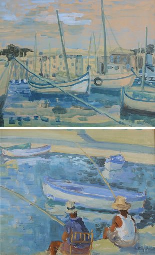 DANIELLS, Antony, (American, 20th C.): 2 Gouaches, ''Fishin''', and ''Boats at Rest'', 19'' x 22'', signed, gold frames with wear, 27'' x 31''. Minor flecks.