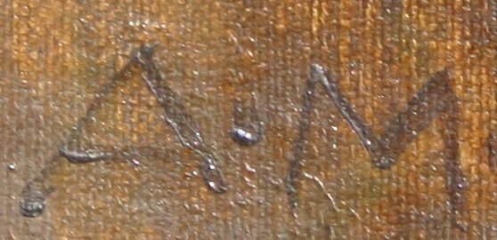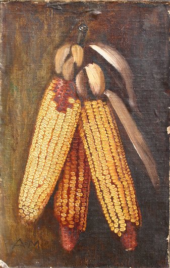 MONTGOMERY, Alfred, (American, 1857-1922): Still Life of Corn, O/C/B, 14'' x 9'', unframed, monogrammed A.M. Needs TLC; several spots of bubbling, some abrasions, paint loss in margins, needs cleaning, unframed, sold as is.