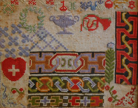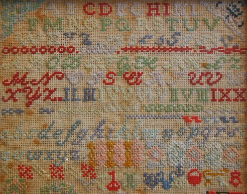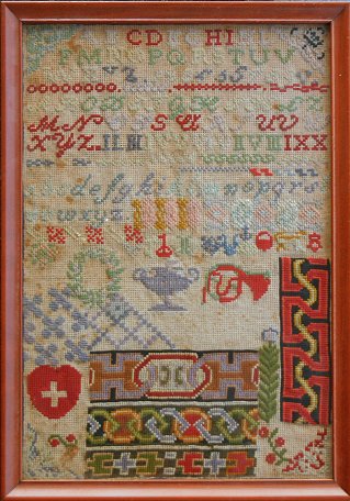19TH C HAND WORKED SAMPLER: Repetition of alphabets and numbers, including Roman numerals. 16'' x 11'', framed under glass.