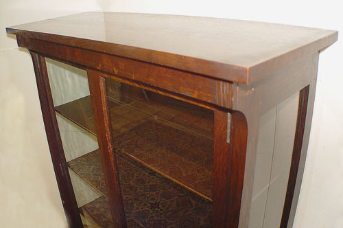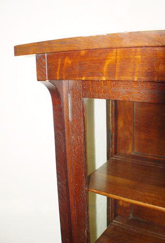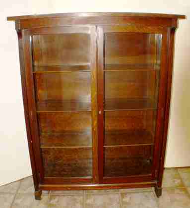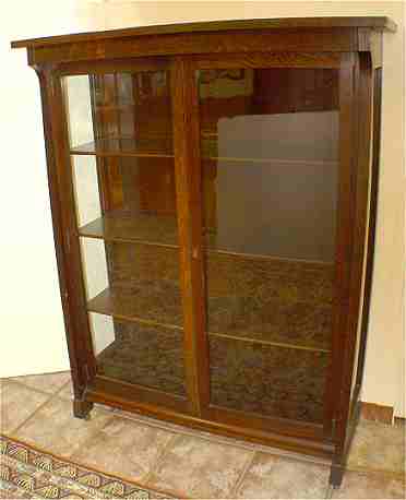 TIGER OAK BOOKCASE CHINA CABINET: Dark oak Arts & Crafts bookcase / china cabinet. Double glass front doors, stationary shelves. 57'' x 49'' x16''.