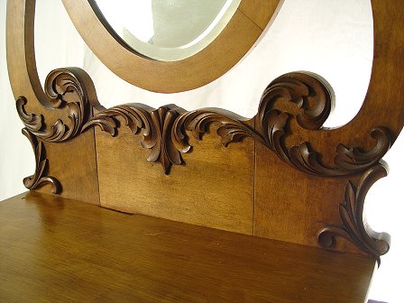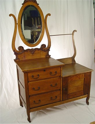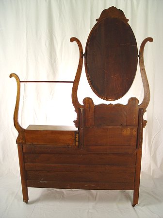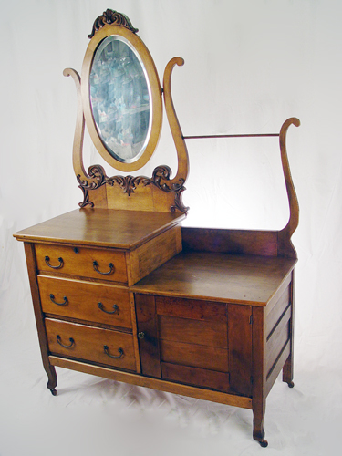 VICTORIAN COTTAGE PINE WASHSTAND WITH MIRROR: Two level with towel bar over on side, oval beveled mirror over the other. Overall height with mirror 69''h, without mirror 45'' x 21 1/2'' s 14''d.