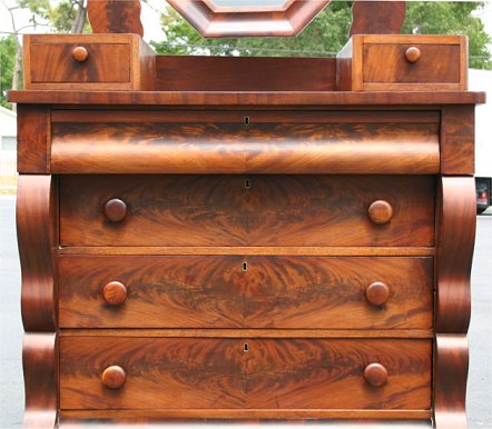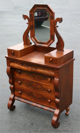 MAHOGANY EMPIRE PERIOD DRESSER WITH MIRROR: Octagonal mirror on shaped arms, glove boxes over 4 drawers, shaped front stiles continue to scrolled feet. 70'' x 41'' x 20'' overall.