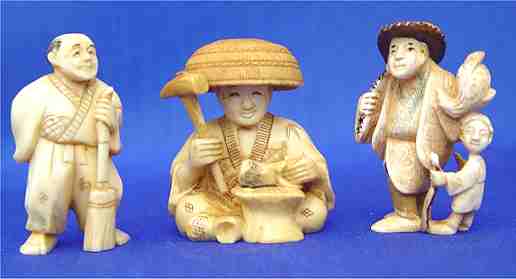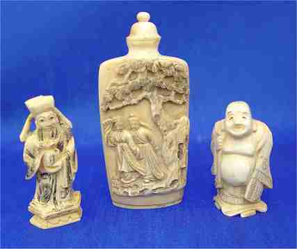 5 CARVED IVORY OKIMONO AND A SNUFF BOX: 1) Snuff bottle, 3 5/8''h. 2) Signed figure of cobbler in large hat, 2''h. 3) Signed man with broom, 2''h. 4) Buddha, 2''h. 5) Man with child, 2''h. 6) Elder man with sack, 3''h.