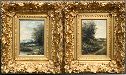PAIR LANDSCAPE PAINTINGS IN SUPER 19TH REGILDED FRAMES: 9'' x 6 1/4'', one piece is signed Foster Adams?, period frames, 17 1/2'' x 14 1/2''.