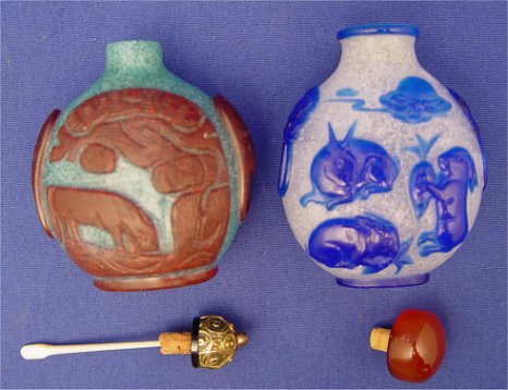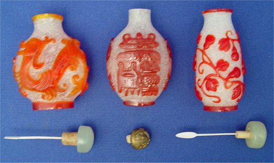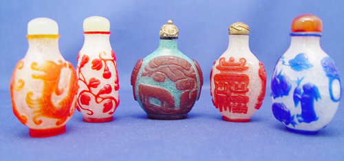 GROUP OF 5 CHINESE SNUFF BOTTLES: 2 3/4''h., layered and carved glass in ruby, cobalt, and brown. All with stoppers, 2 missing the spoons.