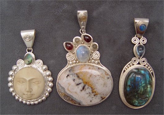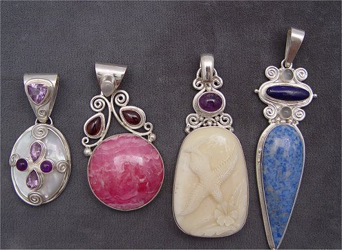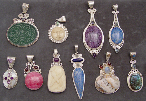 LOT OF TEN SAJEN STERLING PENDANTS: Signed Sajen 925 sterling pendants set with assorted semi precious stones, carved bone - moon face & hummingbird at flower and carved abalone cameo. Size 2 1/8'' to 4 1/8''.