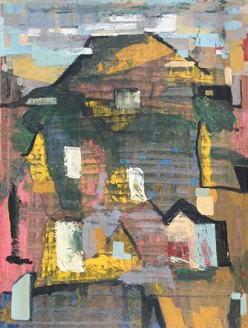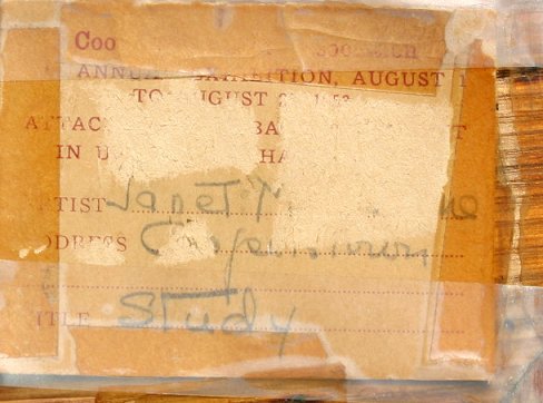 JANET? ABSTRACT O/C COOPERSTOWN PAINTING: Partial label verso, 24'' x 18'', unsigned, barnwood frame, 31 1/2'' x 25 1/2'', The Four Arts, Palm Beach exhibition label verso, also Cooperstown label partial.