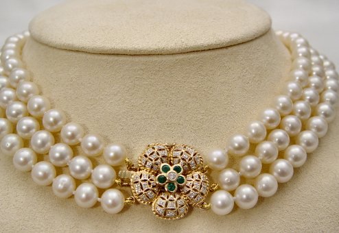 TRIPLE STRAND OF CULTURED PEARLS WITH DIAMOND AND EMERALD CLASP: 7-7.5mm cultured pearls of white, double knotted, shortest strand approx. 17''l., delightful flower clasp of 14k yellow gold, diamonds and emeralds. Est. $1500/2000**