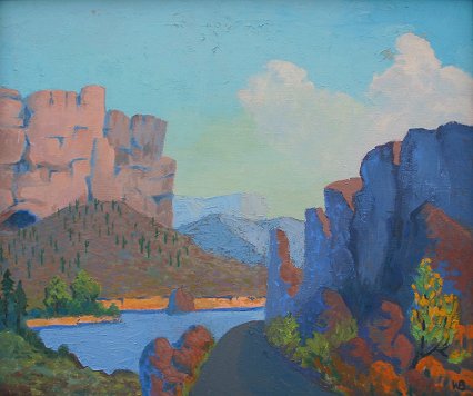 BEACH, Warren, (American, 20th C.): Southwestern Landscape, O/C, 20'' x 24'', monogrammed LR, framed, 21'' x 25. Minor flaking in sky and scattered throughout, needs restoration.