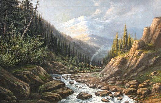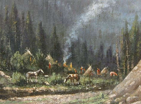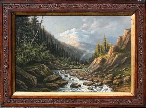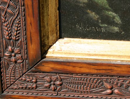 CARSON, W.A., (American, 19/20th C.): Northwestern Landscape with Indian Encampment, O/C, 20'' x 30'', signed, period carved wood and gesso frame with fern and floral motif, repaired, 27'' x 37''. Wax reline, inpaint in sky and right margin from stretcher bar wear.