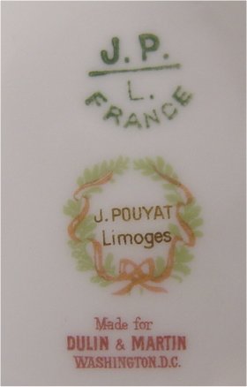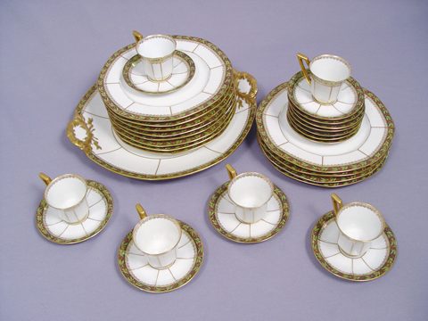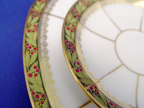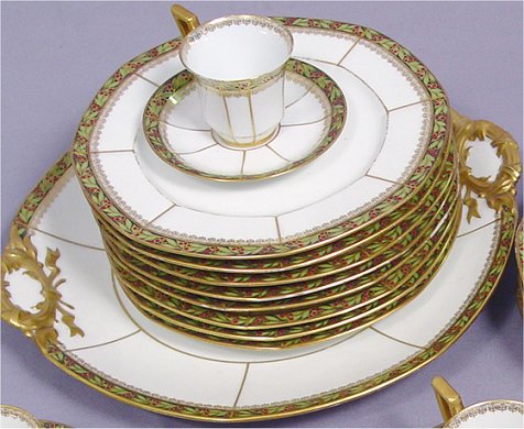 HOLLY DECORATED FRENCH LIMOGES DESSERT OR BREAKFAST SET: Jean Pouyet Ca. 1914-1932. To include a serving plate, 13'' dia, 12 plates, 8 1/2'' dia. and 6 demi cups with 12 saucers.