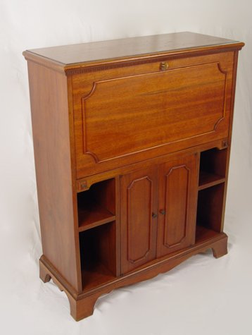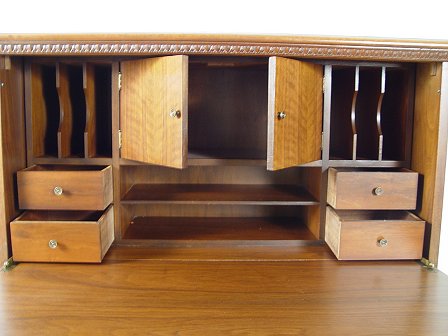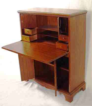 MAHOGANY DROP FRONT CONSOLE DESK CA. 1940'S: Straight front desk and bookcase, the interior fitted with pigeon holes and drawers. 42'' x 34'' x 14''.