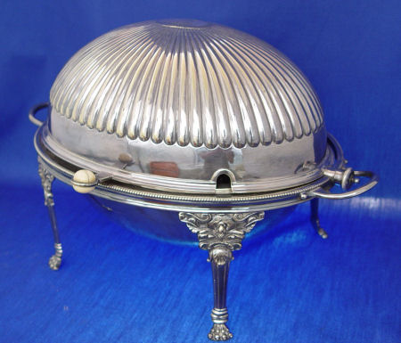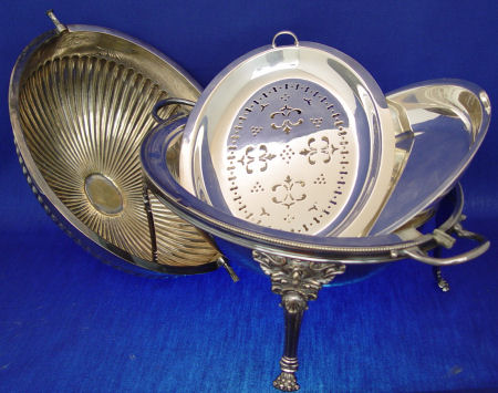 LARGE SILVERPLATE BREAKFAST SERVING DOME: Complete with two inserts. Ribbed cover revolves to the underside to expose two inserts, one of them is pierced. Ivory knob handle, beaded rim, raised on ornate paw feet. Unidentified maker *R & S. 10''h. x 16'' x 9''.