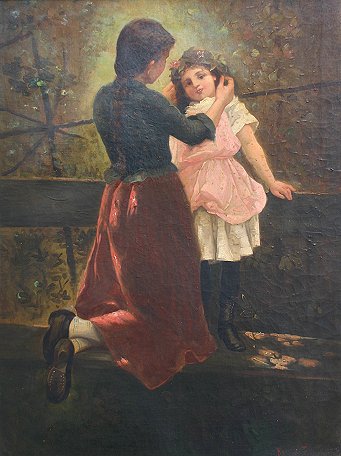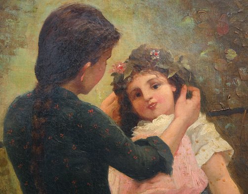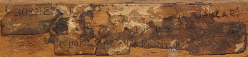 ROSNER, F., (European, 19/20th C.): ''Preparing for the Festival'', O/C, 25'' x 19'', signed Rosner F., partial label verso, overpainted worn frame 29'' x 22''. Nicotine/tar buildup, needs cleaning, mild craquelure.
