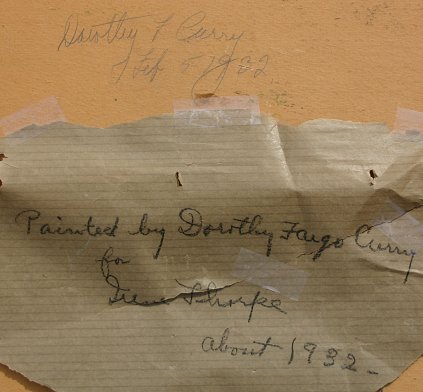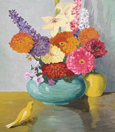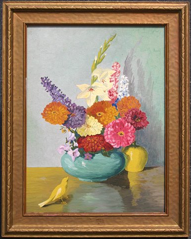 CURRY, Dorothy, (American, 20th C): Floral Still Life with Yellow Canary, O/B, 16'' x 12'', signed Dorothy Farge Curry and dated 1932 verso, gold frame with wear, 19 1/2'' x 15 1/2''.