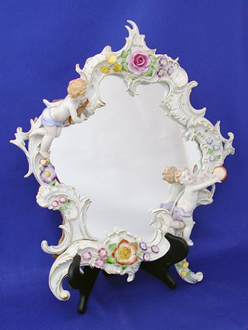 DRESDEN TYPE PORCELAIN CHERUB DECORATED MIRROR: Gold accentuated scrolls, applied cherubs and floral decorations. Please note loss of mandolin handle. Wall mount. 15'' x14''