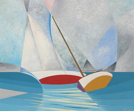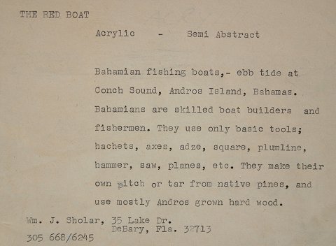 SHOLAR, William J., (American, 20th C.): ''The Red Boat'', Abstract of Bahamian Fishing Boats, A/B, sight size 15'' x 22'', label verso, worn chrome frame, 27'' x 32''.
