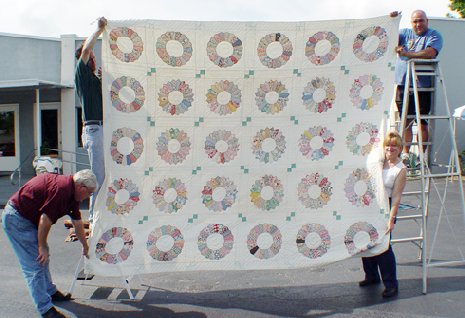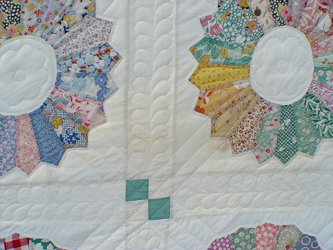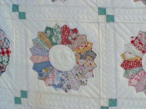 EXTRA LARGE HAND SEWN DRESDEN PLATE QUILT: Purchased in the Shenandoah Valley several decades ago. Approx 123 1/4'' x 10 3/4''.