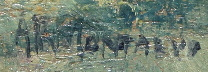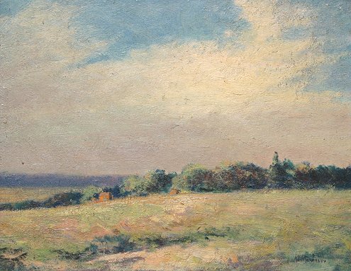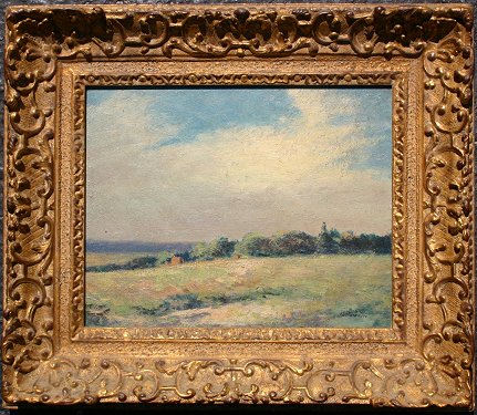 IMPRESSIONIST LANDSCAPE ILLEGIBLY SIGNED LOWER RIGHT: Meadow with Cabin, O/M, 8'' x 10'', signed, gilded gesso frame, 12 1/2'' x 14''. Needs cleaning, minor abrasions.