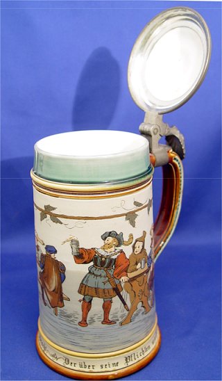 2 METTLACH STEINS: 1) #2028, 1 liter, hinged lid, 9 3/4''h. overall. 2) #1725, inlaid lid, 1/4 liter, 6 1/2'' h. overall, with a little discoloration to the interior. Sold with a souvenir type later cobalt glazed stein.