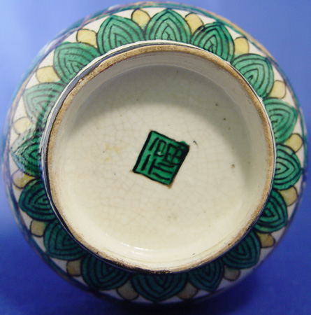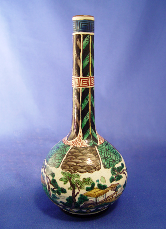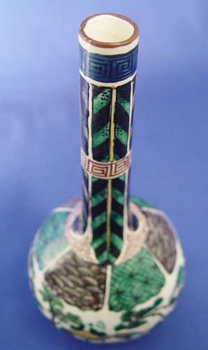 POLYCHROME JAPANESE KUTANI VASE: 7 1/2''h. Bottleneck vase, signed in characters.