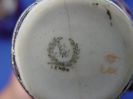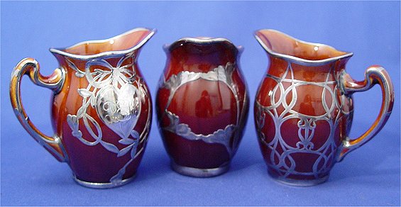 7 PIECE COLLECTION OF LENOX SILVER OVERLAY CHINA: A variety of designs on 3 cream pitchers (approx. 3 1/2''h), and a 4 covered sugar bowls. Silver on brown Lenox, all pieces marked.