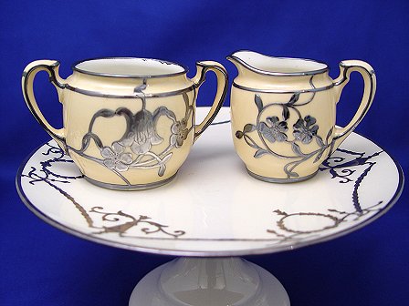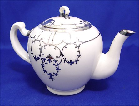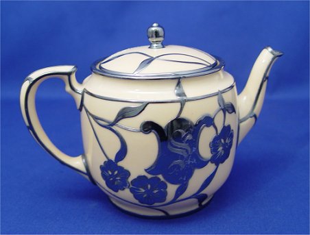 9 PIECE COLLECTION OF LENOX SILVER OVERLAY CHINA: A matched 3 piece tea set with 4'' pot, creamer and sugar, a larger teapot, 6''h., 2 sets of cream pitchers and sugars and a cake pedestal. All pieces except the cake pedestal are marked Lenox.