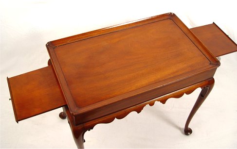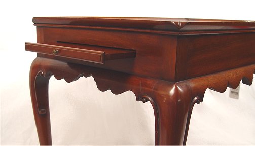 KITTINGER QUEEN ANN STYLE TEA TABLE: Elegant mahogany tea table with candle slides. Style is circa 1735-1750. Gracefully scalloped apron and hand carved cabriole legs. Piece marked with impressed Williamsburg Restoration and Kittinger stamps as well as the Kittinger paper label. 26 1/4''h, x 29 1/4'' x 17 3/4''.