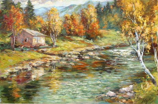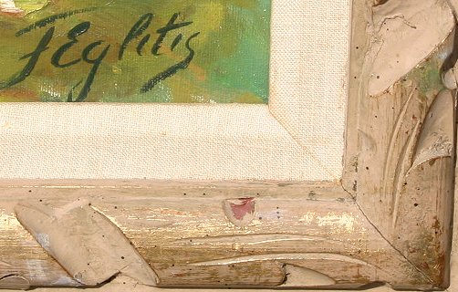 EGLITIS, Fred, (Latvian, 1912-1996): Stream and building, O/C, 24'' x 36'', overall 32 1/2'' x 44 1/2''. From the estate of Fred Eglitis.