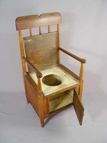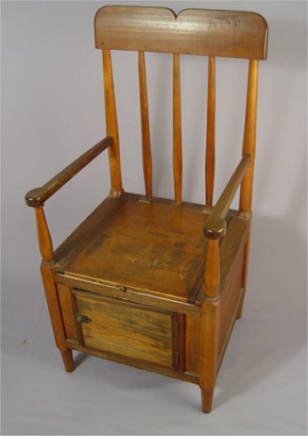 AMERICAN 19TH C COMMODE POTTY CHAIR: Oak, ash, pine and cherry, 3 turned spindles, flat cut arms, turned supports, hinged seat cover, turned legs. 34'' x 16'' x 15 1/2''.