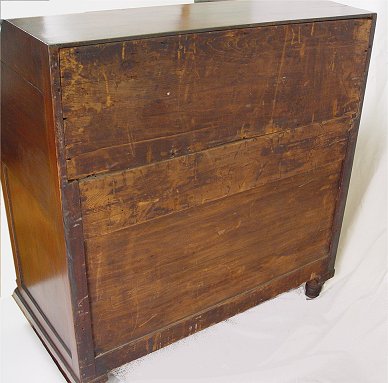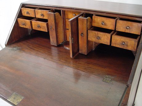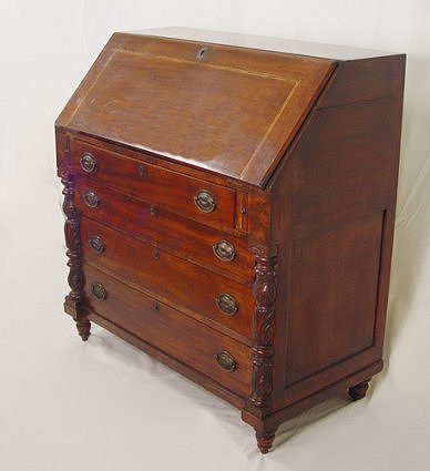 1850 PENNSYLVANIA MAHOGANY SLANT FRONT DESK: Carved stiles, 4 drawer front with the upper drawer extending over three. Behind the banded slant front is an interior of drawers, pull out letter slots, and cubicles. Paneled back. 43''h. x 40'' x 21''.