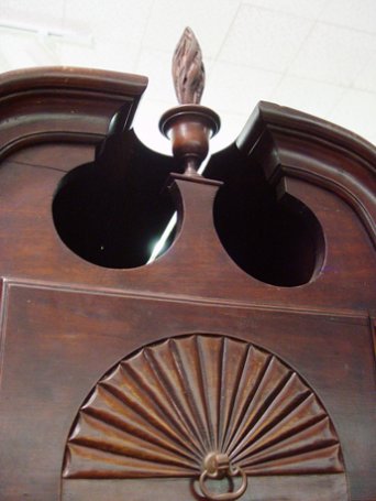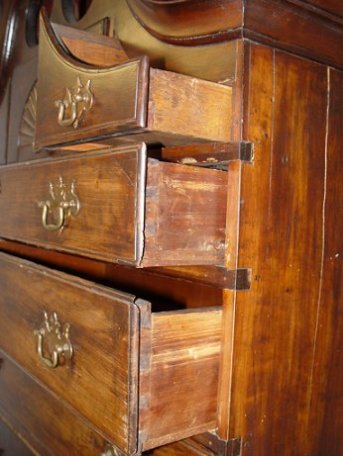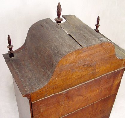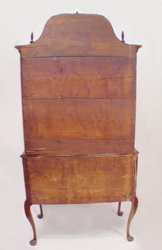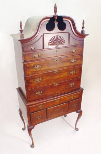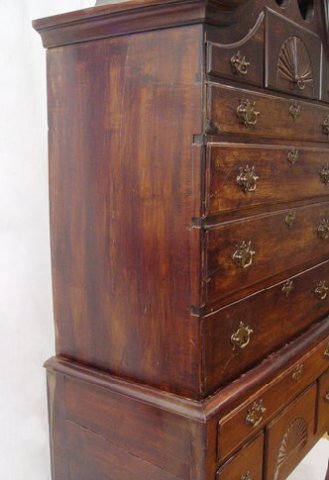 CA. 18TH C PERIOD QUEEN ANNE BONNET TOP HIGHBOY: Chest on stand, flame carved finials, fan carved center front drawers. 11 drawers in all. 87 1/2''h. X 39'' X 20 1/2''. Please call for details and condition. Est. $3000/4000**