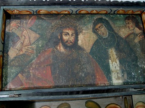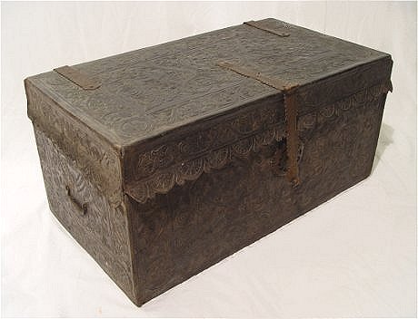 1880's PERUVIAN SPANISH COLONIAL CHEST: Hand tooled embossed leather over wood. The interior of the lid is painted in a religious scene with figures including Mary and Jesus. The interior of the chest has later polychrome folk art floral design. Iron hardware. 16''h. x 33 1/2'' x 18 1/4''. Est. $3000/5000**
