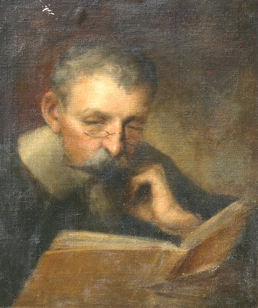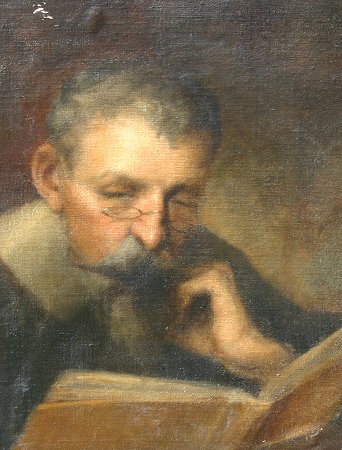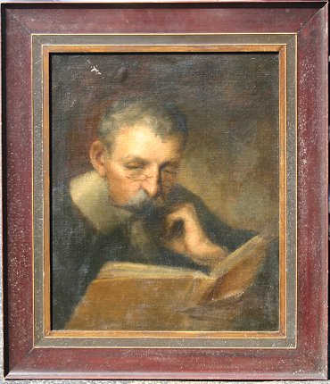 INTERESTING 19TH PORTRAIT OF A SCHOLAR, O/C/B: 24'' x 20'', no visible signature, later frame with wear, 31 1/2'' x 27 1/2''. Laid, with older sporadic inpaint, some minimal bubbling of canvas from board, paint fleck upper left, needs cleaning.