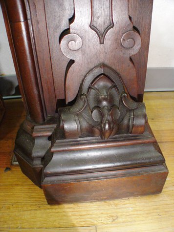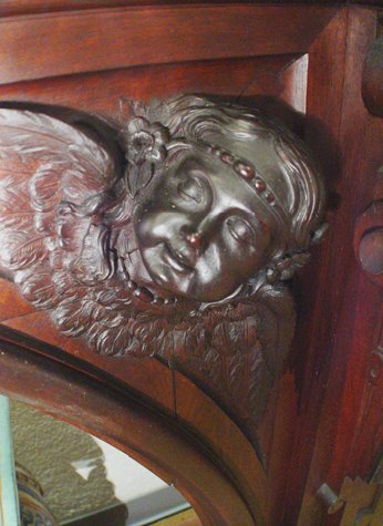 19TH C FINE CARVED MAHOGANY MANTLE: With raised burled panels and sides. Carved cherub heads in each of the corners of the arched opening. 48''h. x 65'' x 18''. The fire opening is 36''h. x 41''w. Est. $2200/2500**