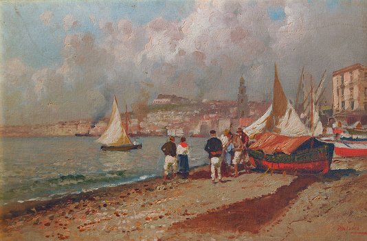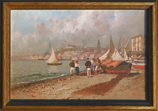 PASINI, Lazzaro, (Italian, 1861-1949): Italian Coastal Village with Figures and Boats, O/C, 11 3/4'' x 17 1/2'', signed Pasini, gold frame with minor wear, 13 3/4'' x 19 1/2''.