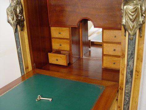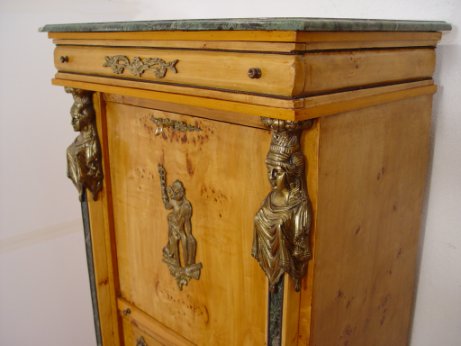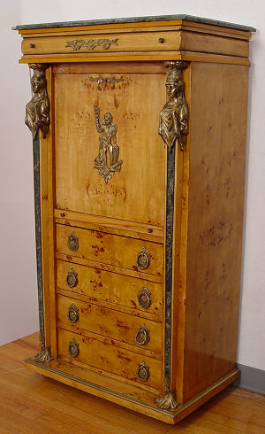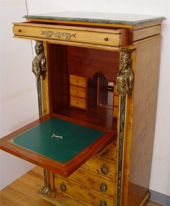 BIEDERMEIER STYLE NEOCLASSICAL REVIVAL EXOTIC BURL WOOD SECRETAIRE ABABTANT: A companion piece to lot 101. The secretary has a green marble top and marble front stiles with brass masquerons at the tops and feet at the bottom. A slender full length drawer over fall front desk. The desk has green leather, the interior is fitted with drawers and a mirror. There is a pull out tray that supports the desk front. 4 full length drawers under the desk. 57 1/4'' x 31'' x 19''.