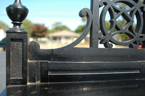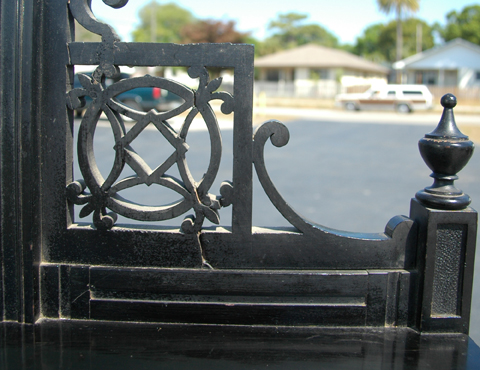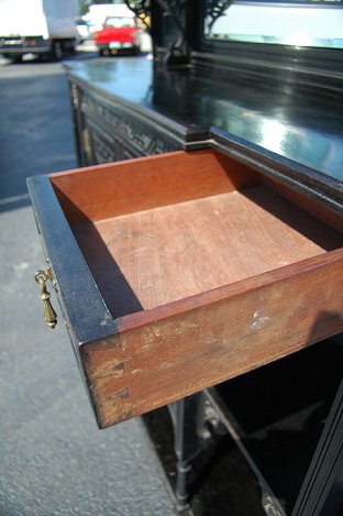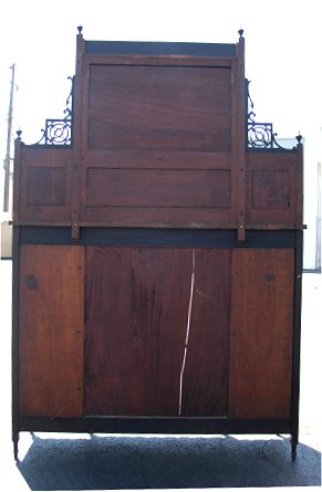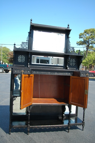 EDWARDIAN VICTORIAN ETAGERE: Pierce and relief carved dark mahogany with central beveled mirror. Full length open shelf, open display and cabinet drawers. 6'h. x 48 1/2''.