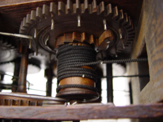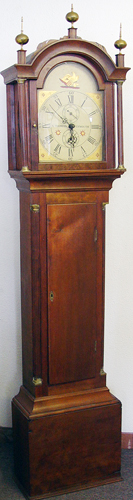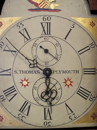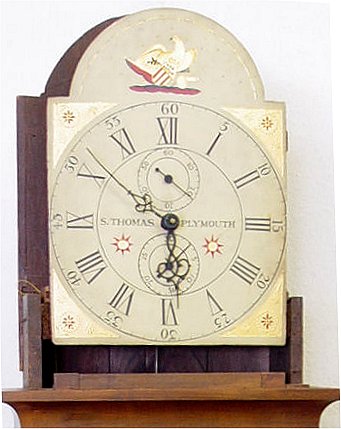 EARLY 19TH C SETH THOMAS EARLY AMERICAN GRANDFATHER CLOCK: The hand painted dial is signed ''S. Thomas Plymouth''. Weight driven wood works are still in working order. Mahogany case with brass fittings and finials. 83 1/2''h. x 18'' x 9''. One family ownership, first time offered to the open market.