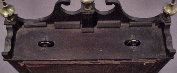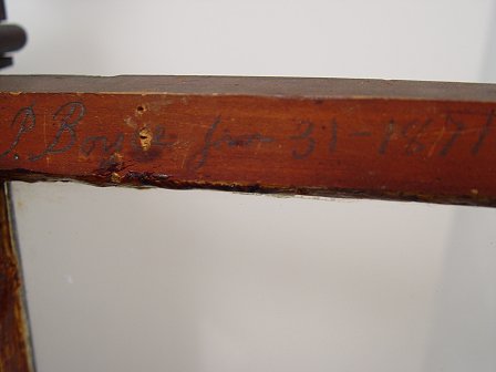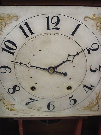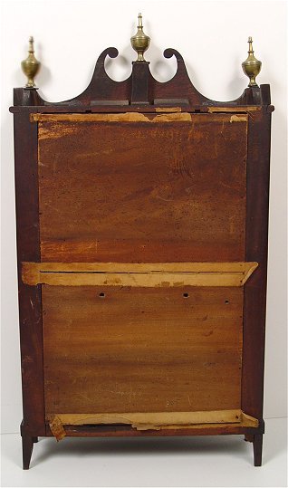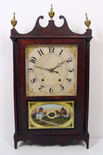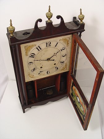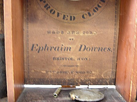19th C EPHRAIM DOWNES MANTLE CLOCK: Mahogany case, hand painted face, two part glass front with original tablet. Key and pendulum included. The case shows age relevant wear. 30 1/2'' x 16 3/4'' x 4 3/8''. Hand script signature on inside of door A.H. Hodges Aug. 23 18*7.