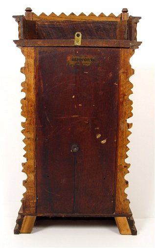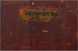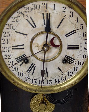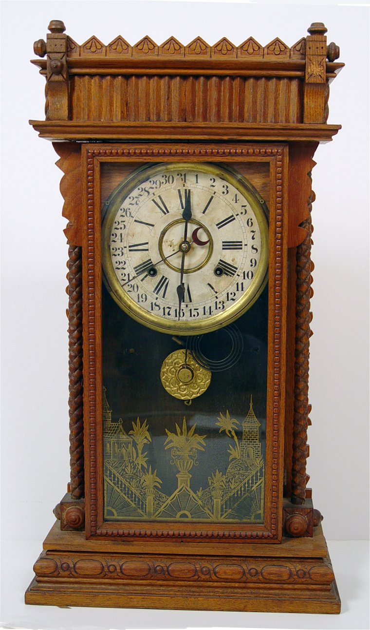 19th C GILBERT OAK CASE CALENDAR CLOCK: Benworth by Gilbert paper label on the back. 8 day, gong strike clock with key and pendulum. In good working order. 27 1/8'' x 15 1/4'' x 5''.