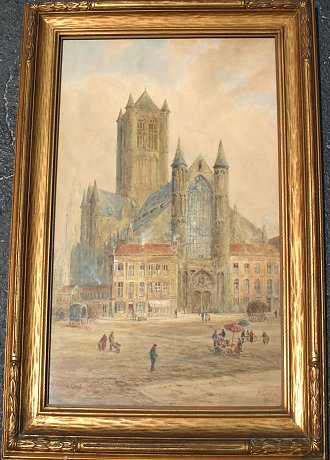CARLTON, Hy, (English, 19/20th C.): ''St. Nicholas Church, Ghent'', W/C, 30'' x 20'', signed Hy. Carlton, titled lower left, exceptional period gilt carved frame, 36 1/2'' x 26 1/2''.
