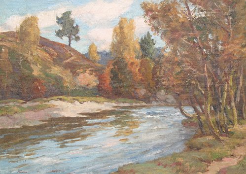 MARTIN, Francis Patrick, (British, 1883-1966): ''On The Dulnain River'', O/CB, 10 1/2'' x 14 1/2'', signed Francis P. Martin, titled verso, worn gold frame, 13'' x 17''.