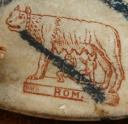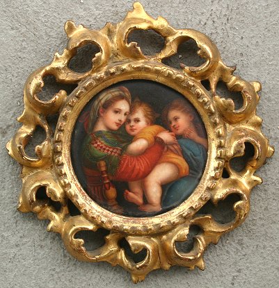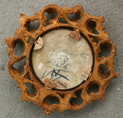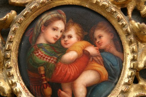 BELLADONNA MINIATURE ON PORCELAIN: Circa 1900, 3 3/4'' diameter, unsigned, encased in carved wood and gilded gesso period frame, 7 1/4'' diameter, Romulus and Remus ink stamp mark verso on porcelain.