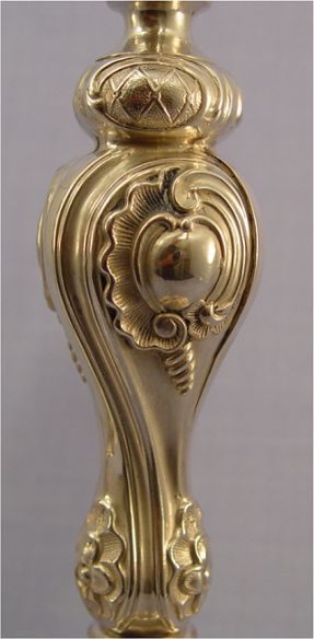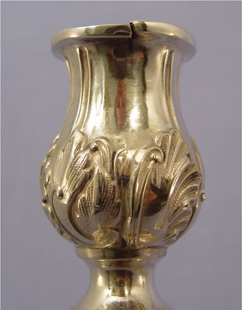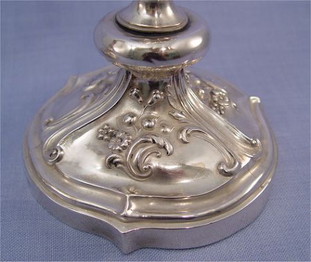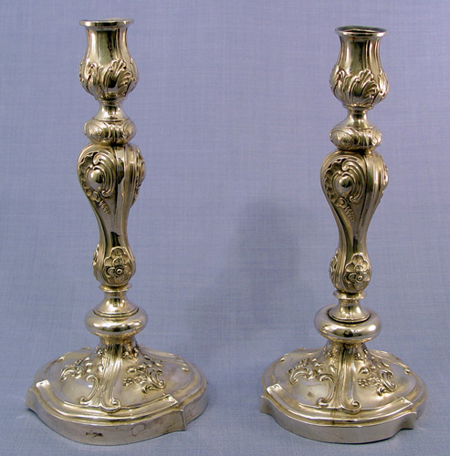 PAIR OF RUSSIAN SILVER CANDLE HOLDERS: St. Petersburg, ca. 1870, silver content 84. Stamped with mark J.T and B.C., the assayer and maker. 11 1/2''h, 5 1/2'' dia.
