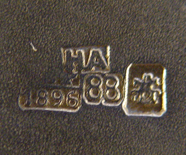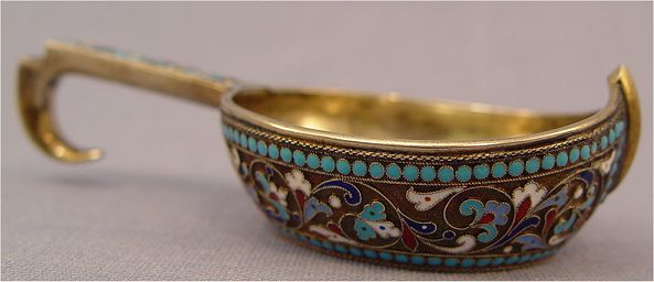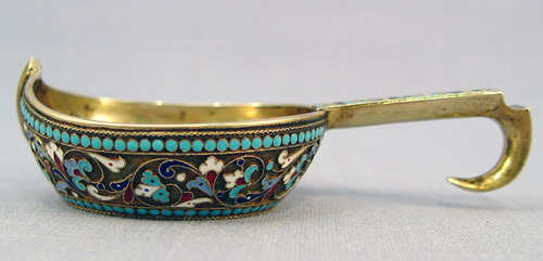 RUSSIAN ENAMEL SILVER KOVSH CA. 1896: Moscow and date mark, maker Nikolai Alekseyev, 4 1/2''l, silver content 88.