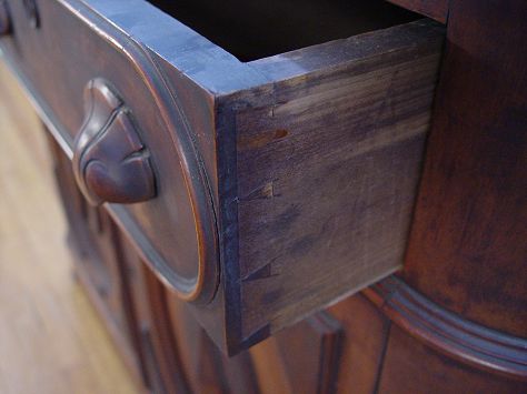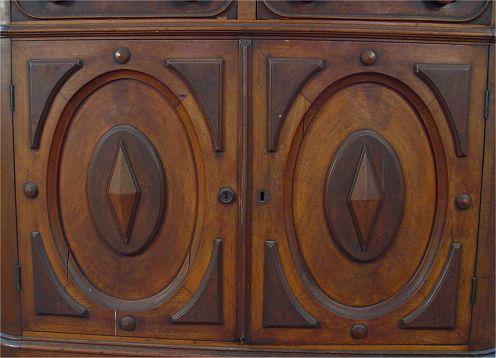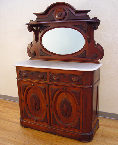 WALNUT VICTORIAN SIDEBOARD: Arched crest over full length mirror, oval mirror, beveled white marble. Lower cabinet has 2 drawers over 2 doors. 76''h. x 48'' x 19''.